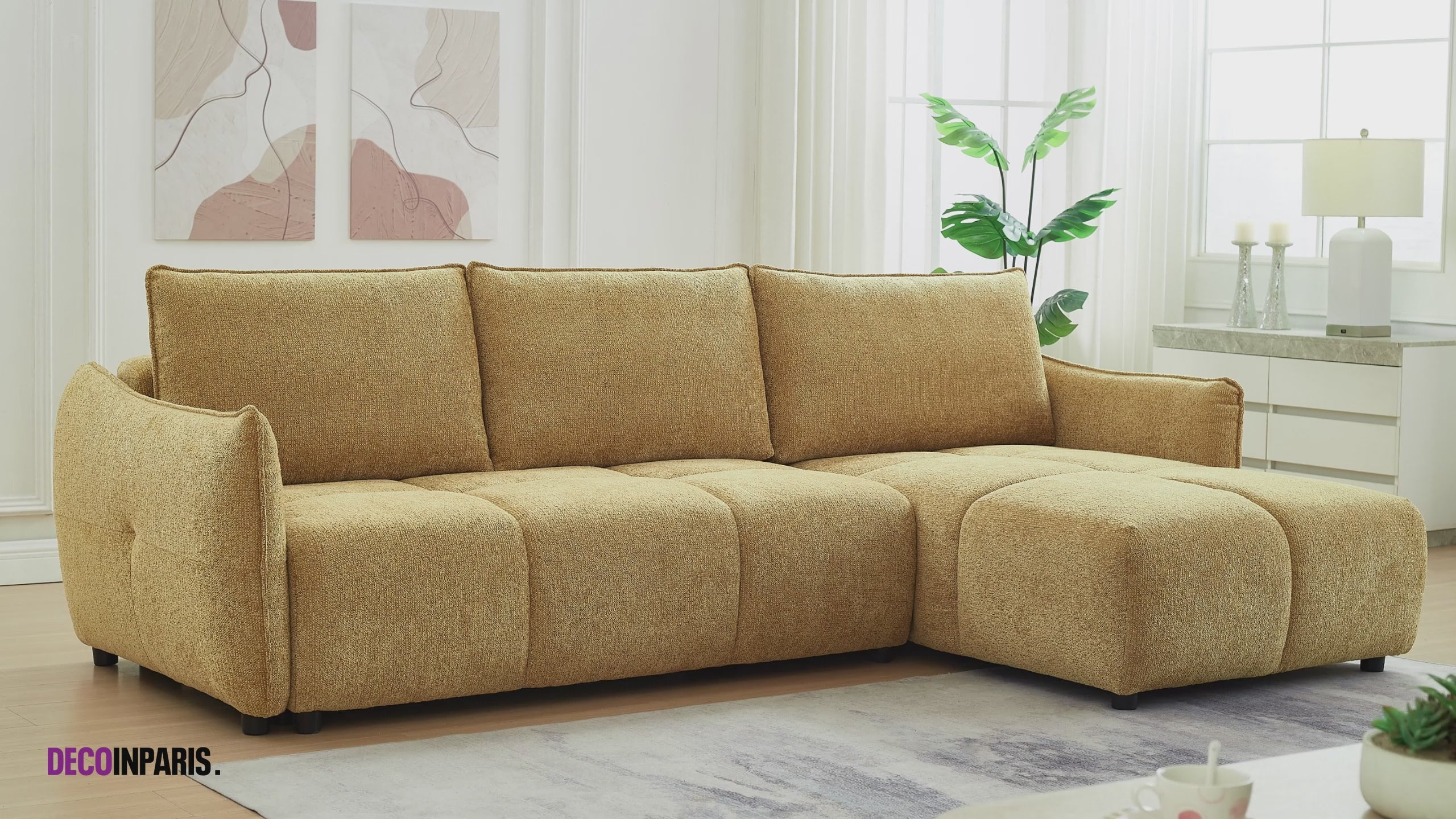 Sofá esquinero convertible y reversible MYSA en terciopelo jaspeado amarillo