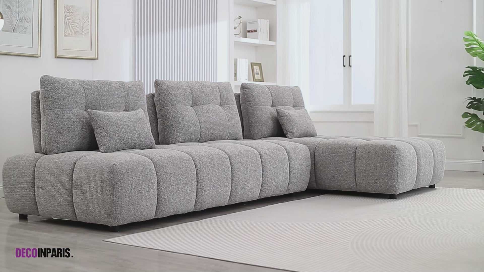 El sofá esquinero reversible ALANA, con respaldo ajustable y tapizado en terciopelo gris jaspeado, combina estilo y máxima comodidad. Su diseño con generoso capitoné y sus amplias dimensiones lo convierten en la opción ideal para salones modernos y elegantes.