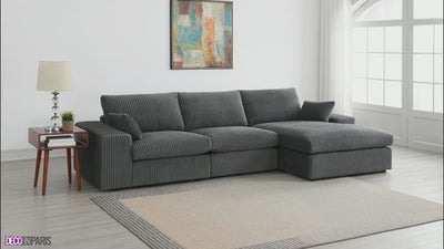 Descubre el sofá esquinero reversible SIRINA en suave pana gris , ideal para añadir un toque de modernidad y elegancia a tu salón. Su estética refinada y su tapizado de pana combinan armoniosamente con todos los estilos de interior, ya sean de diseño, clásicos o contemporáneos.