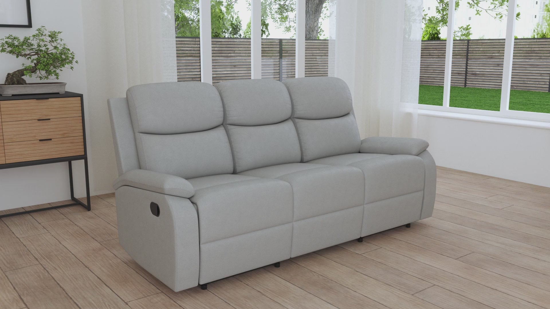 Deléitese con nuestro sofá reclinable manual de 3 plazas JACOB en piel sintética gris claro.