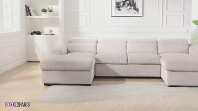 Descubre la elegancia y la practicidad combinadas en el sofá panorámico convertible en forma de U VELORA con almacenaje en terciopelo jaspeado beige.