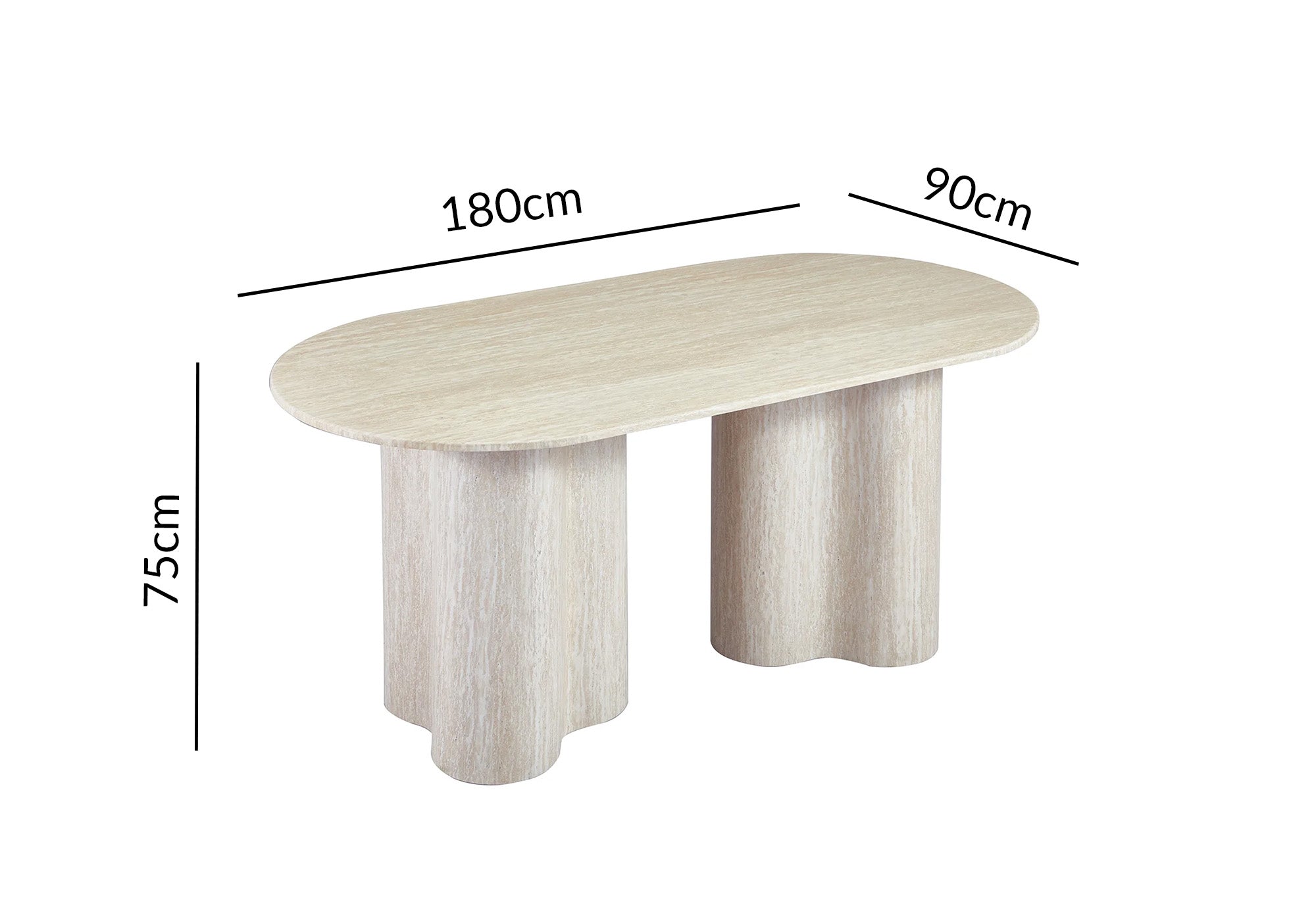 Su encimera ovalada de mármol compuesto con efecto travertino ofrece una superficie brillante y refinada, ideal para aportar un ambiente suave y natural a su comedor.