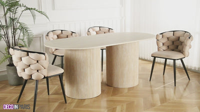 Con capacidad para hasta 8 personas, el diseño único de la mesa DHARA se ve realzado por sus patas anchas y redondas, elaboradas con un estilo limpio y contemporáneo. Estas patas robustas y armoniosas aportan estabilidad y un toque artístico, a la vez que refuerzan la estética moderna de la habitación.